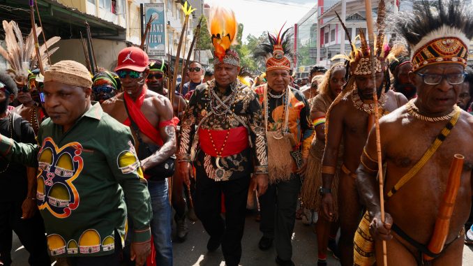 Gubernur Papua Matius Fakhiri dan Wakil Gubernur Aryoko Rumaropen disambut meriah melalui prosesi adat dari lima wilayah besar: Mamta, Saireri, Mee Pago, La Pago, dan Anim Ha.